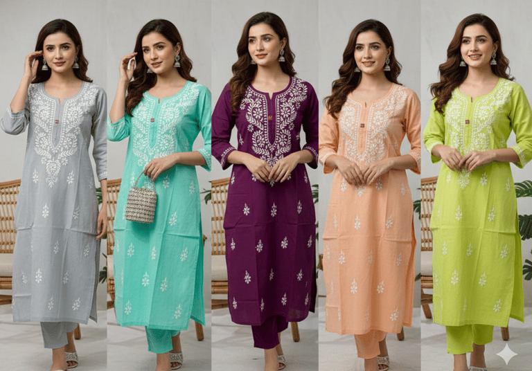 Our artisans master traditional stitches like bakhiya and jali, bringing authentic Lucknow chikan work to life in every garment.